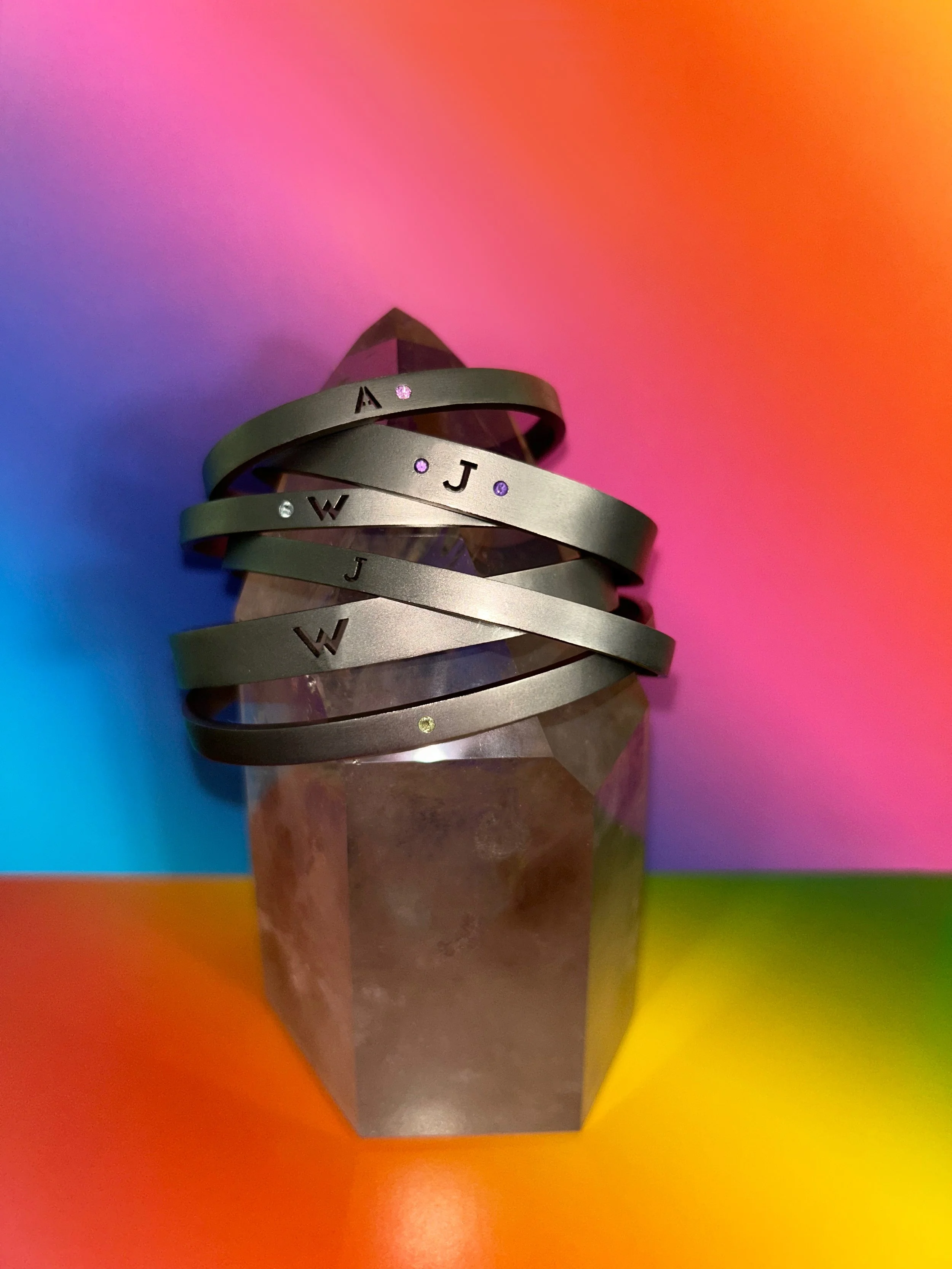 Une collection de bracelets en titane entièrement personnalisables, disponibles en deux largeurs, figurant votre lettre fétiche en découpe laser et sertis ou non de pierres fines au choix parmi 5 pierres.
